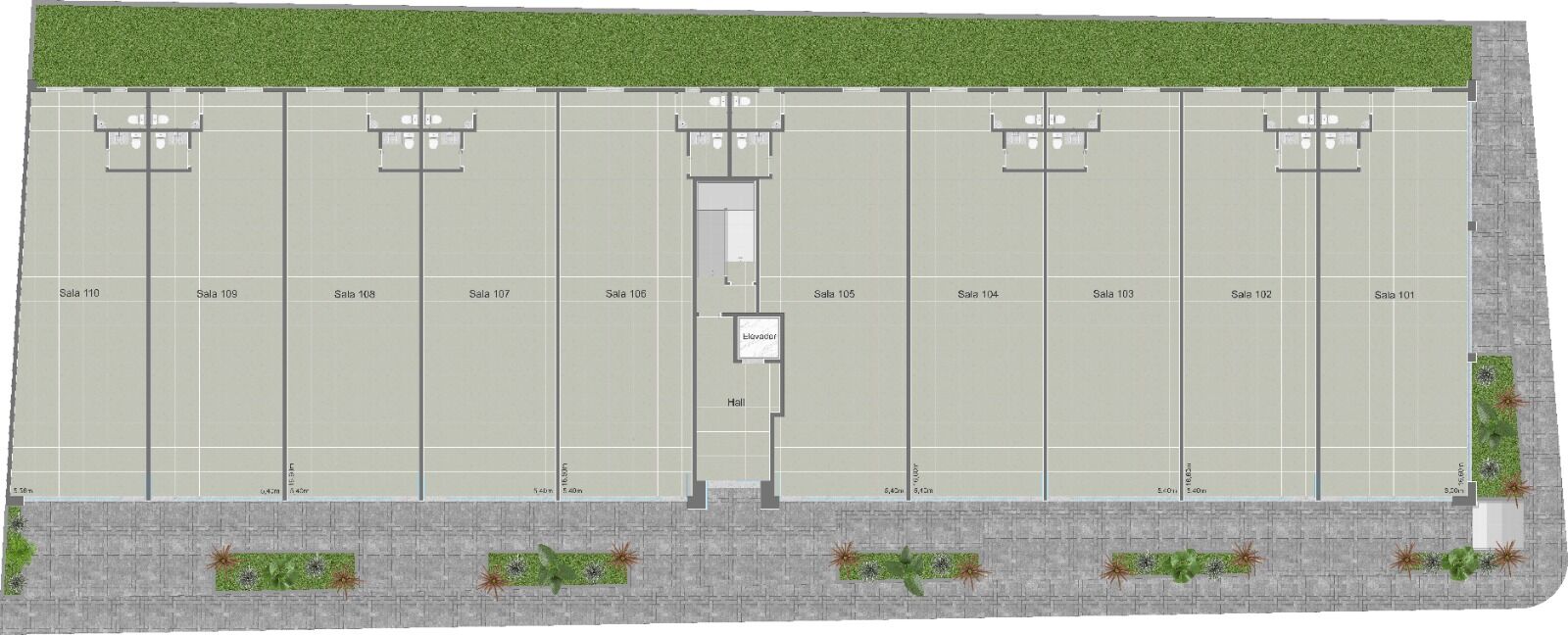 Conta com 29 salas comercias e 22 vagas de estacionamento em um total de 2.877m2. Possui ótima posição solar pois recebe o sol da manhã na fachada da frente e sol à tarde nas salas dos fundos.